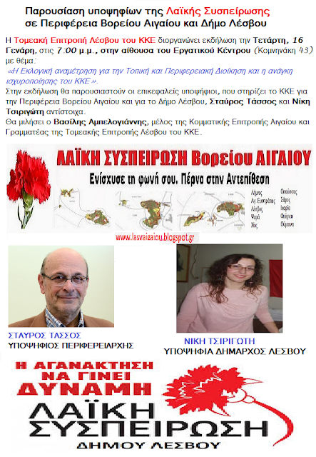 Στην εκδήλωση θα παρουσιαστούν οι επικεφαλείς υποψήφιοι, που στηρίζει το ΚΚΕ για την Περιφέρεια Βορείου Αιγαίου και για το Δήμο Λέσβου, Σταύρος Τάσσος και Νίκη Τσιριγώτη αντίστοιχα.